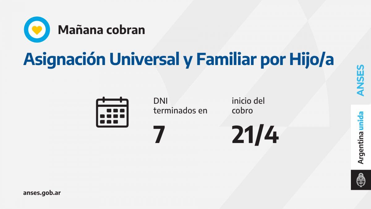 Las fechas de cobro de la prestación correspondiente se determinan en base al número en que termina el DNI de. Quien hasta agosto cobraba 4504 por hijo por Asignación a partir del 1 de septiembre cobrará 5063. El padre o madre a cargo puede cobrar directamente sin contar con el consentimiento del otro padre o madre presentando el Formulario de cobro de Asignaciones Familiares.
